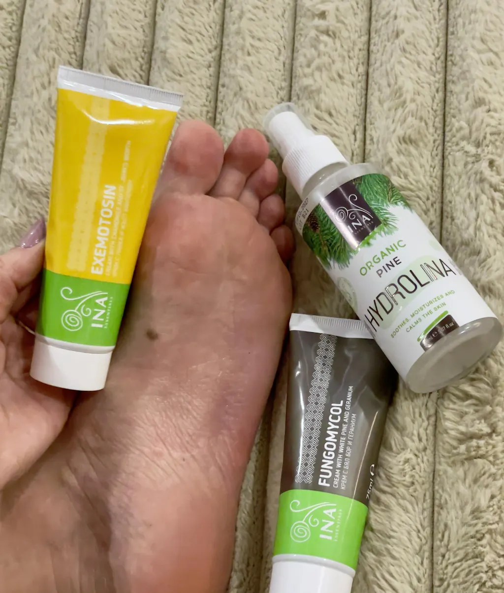Vsak večer sem začela uporabljati hidrolino iz belega bora na umite noge, potem ko sem jih umila s koprivnim milom. Nato sem uporabila kremo Fungomikol, vendar sem po nekaj dneh prešla na Exemotosin, ker nisem opazila bistvenih rezultatov. Po dveh tednih umivanja s koprivnim milom, pršenja z hidrolino in nanašanja Exemotosina vsak večer je vse izginilo kot po čudežu in ni niti sledu o poškodovani koži, izpuščaju ali srbenju.